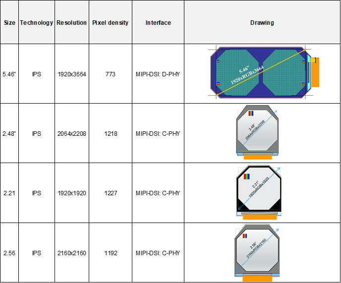 尺寸/解析度: 2.21"1920x1920, 2.56"2160x2160, 5.46"1920x3664, 2.48"2064x2208